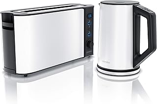 Arendo - Bouilloire en acier inoxydable avec niveaux de température 1,5 l et grille-pain à fente longue pour 2 tranches de toast et grille réchauffe-viennoiseries blanc mat.