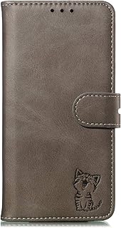 Fatcatparadise Coque Compatible LG K20 2019 [avec Verre Trempé], Bookstyle Motif de gaufrage Housse Imprimé en PU Cuir Case à Rabat Coque de Protection Portefeuille Cover (Gris)