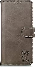 Fatcatparadise Coque Compatible OnePlus 7 [avec Verre Trempé], Bookstyle Motif de gaufrage Housse Imprimé en PU Cuir Case à Rabat Coque de Protection Portefeuille Cover (Gris)