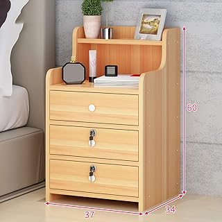 OFAY Table De Chevet Haute Simple avec 3 Tiroirs, Table De Chevet avec Table De Chevet Table Basse avec Serrure avec Étagère Ouverte Et Tiroir De Verrouillage pour Dortoir Universitaire Familial,Wood