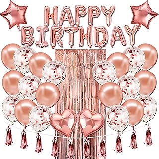 Fanuk Ballons Anniversaire Rose Gold, Kit Anniversaire Fille Ballon Happy Birthday Rose et Or, Ballon Confettis, Ballon Coeur et Etoile, Rideau et Guirlande à Franges, Décoration de Fête Soirée Party
